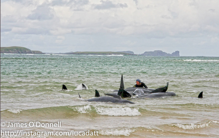 Berrow, who will visit west Donegal this weekend, said, “In contrast, it was someone from our group, Brendan Quinn, who called one of our senior members, Mick O’Connell, who in turn called the wildlife service in Glenveigh and got no response. Mick then called David McNamara, a wildlife service ranger, who went to the scene at Ballyness beach and observed the situation from a nearby hill with hundreds of people gathered around the beached whales. He then waited for them to leave the scene.”